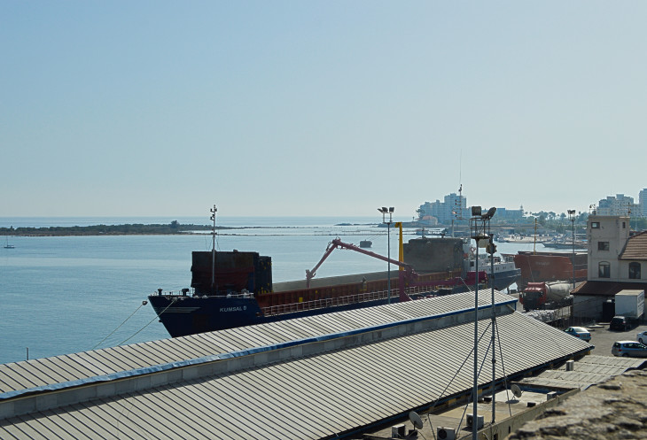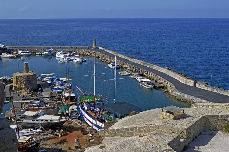 По крутой лестнице поднимаемся на башню. С нее виден порт Фамагусты.Когда то здесь пересекались торговые пути купцов из Европы и Азии. В настоящее время это главный порт ТРСК и военно-морская база Великобритании.