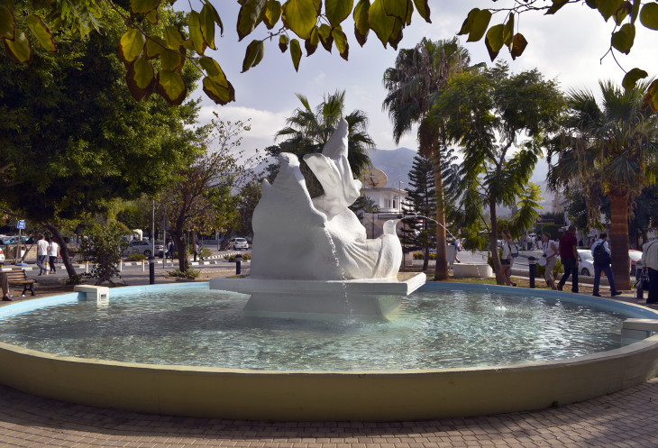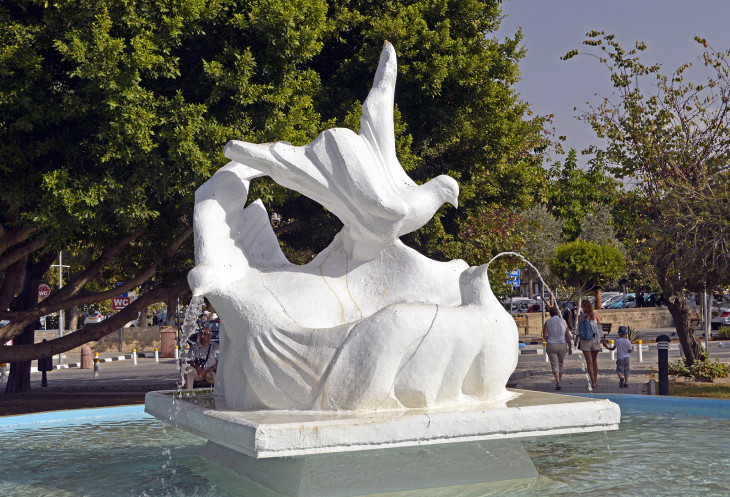 На центральной площади Кирении расположился интересный фонтан с голубями.