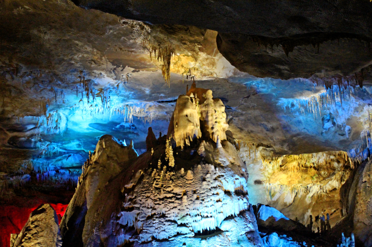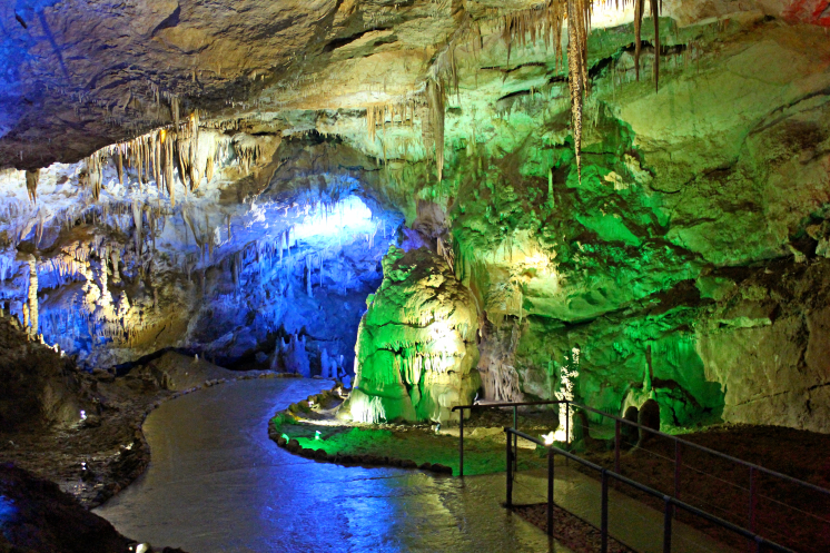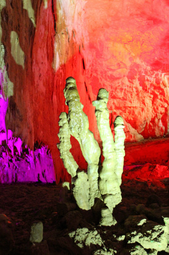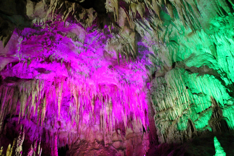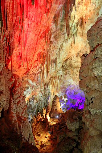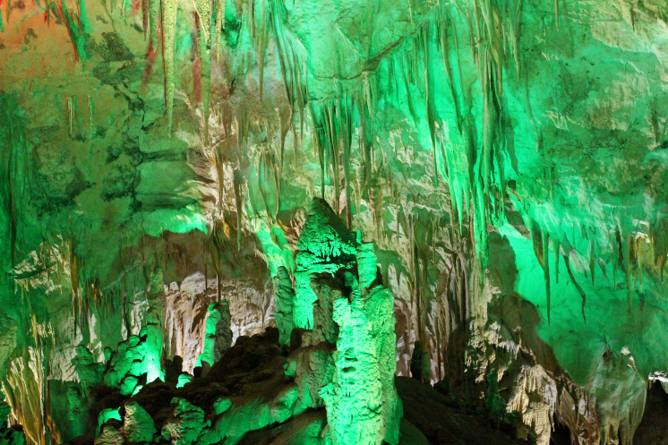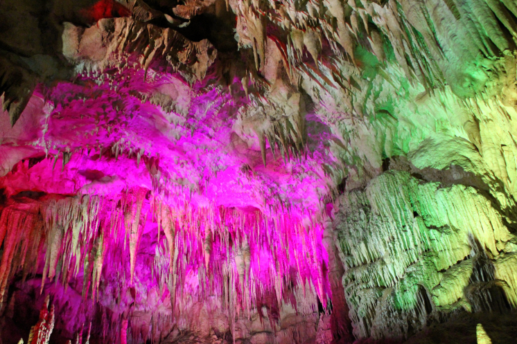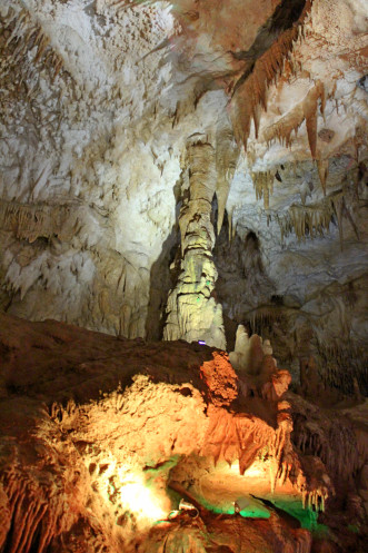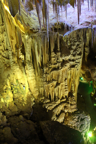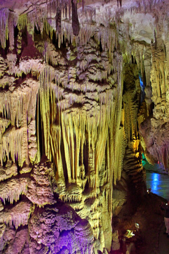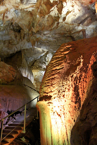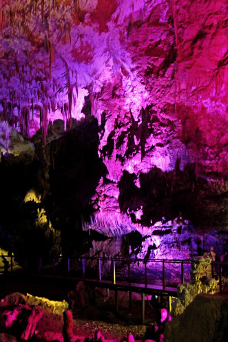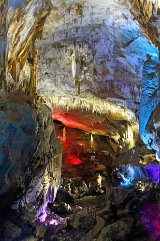 Нас повели по главной тропе длиной в 1 км и мы переходили от одного зала с античным названием к другому. Сталактиты и сталагмиты причудливых форм то свисали с потолка, то вырастали снизу. Каждый сантиметр данных образований формируется 100 лет. Сложно представить себе возраст пещеры, поскольку некоторые из образований вытягивались на несколько этажей жилых зданий.