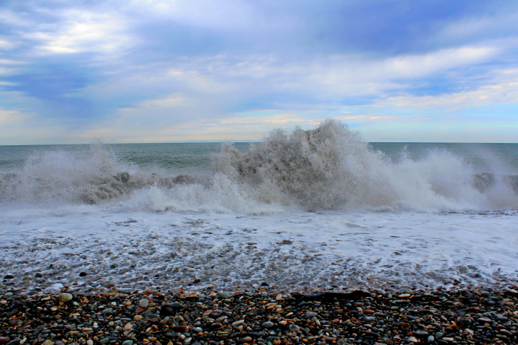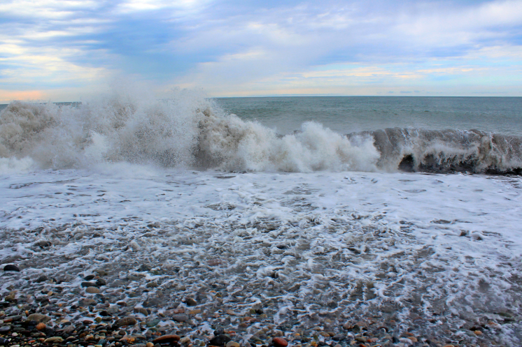 Берег моря здесь крупногалечный. Мощные волны накатывали на камни, оставляя после себя густую пену.