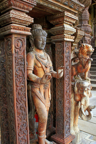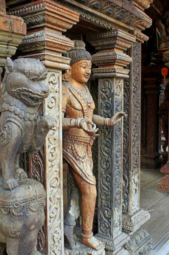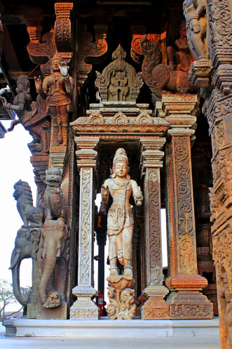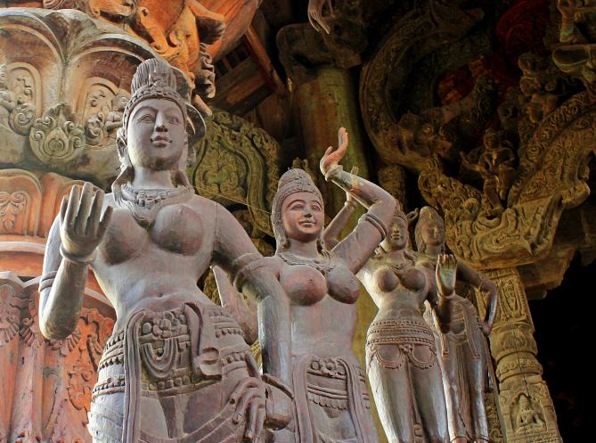 Все скульптуры храма истины выполнены местными мастерами из цельного куска тикового дерева. Сооружение причудливым образом крепится без единого гвоздя. Гвозди используются лишь для прикрепления скульптур к месту, в самих скульптурах швы и соединения отсутствуют.
