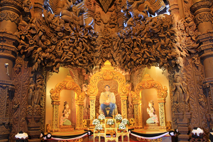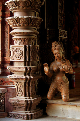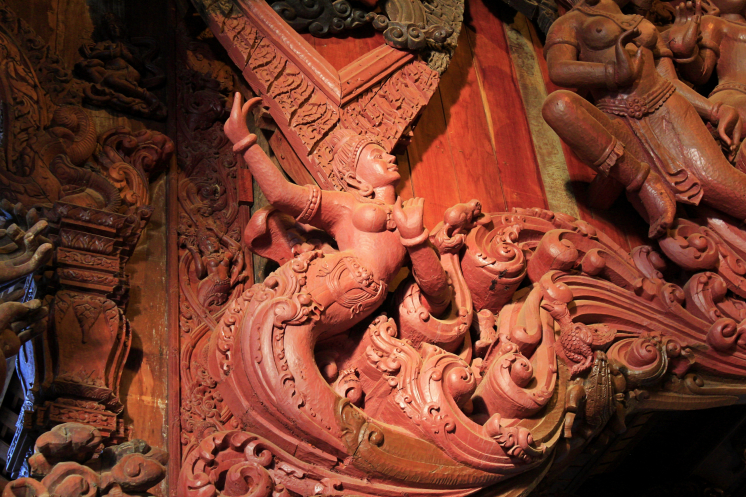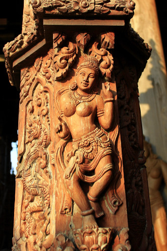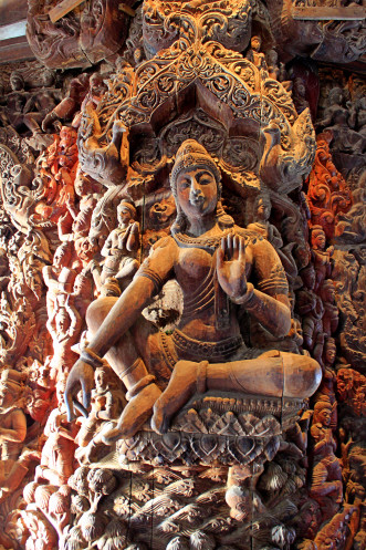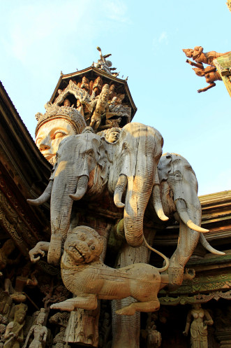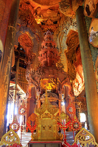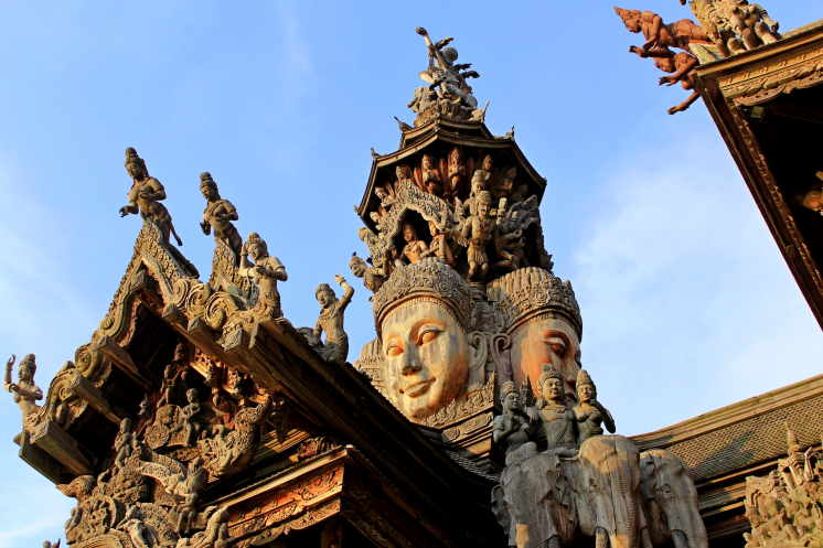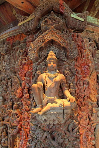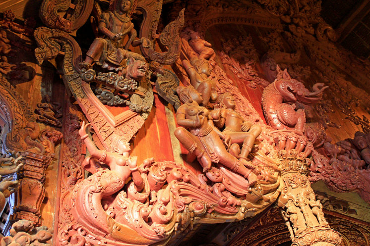 Помимо всего прочего, храм истины - самая высокая в мире конструкция, при строительстве которого использовалась древесина ценных пород. Сооружение пестрит резными скульптурами персонажей буддийской религии, животных и растений. Храм поделен на четыре тематических зала: Индия, Китай, Камбоджа и Таиланд.