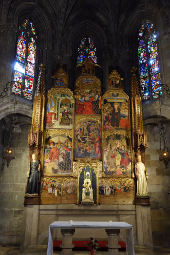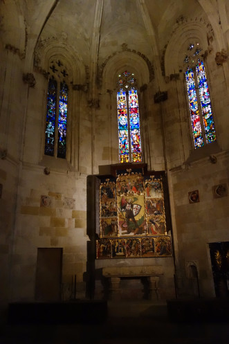 С собором нам не повезло — там проводили какую-то муниципальную сходку, потому вход в самые лакомые места типа Капеллы коннетаблей был закрыт. Вот тут, наоборот, сохранился только один оригинальный витраж — остальные рухнули при взрыве крепости, а этот прикрыла собой от взрывной волны Капелла. Но внешне собор хорош, спору нет — махровая испанская готика.