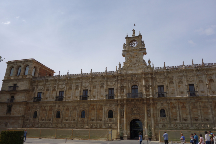 А ближе к вечеру мы добрались до Леона. Начали с осмотра монастыря Святого Марка. Жалко, часть фасада на реставрации. Монастырь процветал во времена популярности пути Св.Иакова, но недолго, во время гражданской войны там был концлагерь, а сейчас находится роскошная 5* гостиница. Мы заходили в бывший зал совета (или что-то вроде этого) с потрясающим потолком и гобеленами. Ну и здание знаменито тем, что имеет самый длинный в Испании фасад в стиле платереско. Кстати, отель фигурирует в уже упомянутом фильме «Путь». О паломниках напоминает скульптура одного из них, отдыхающего после долгой дороги: место считается обязательным для посещения (не сам отель, конечно).