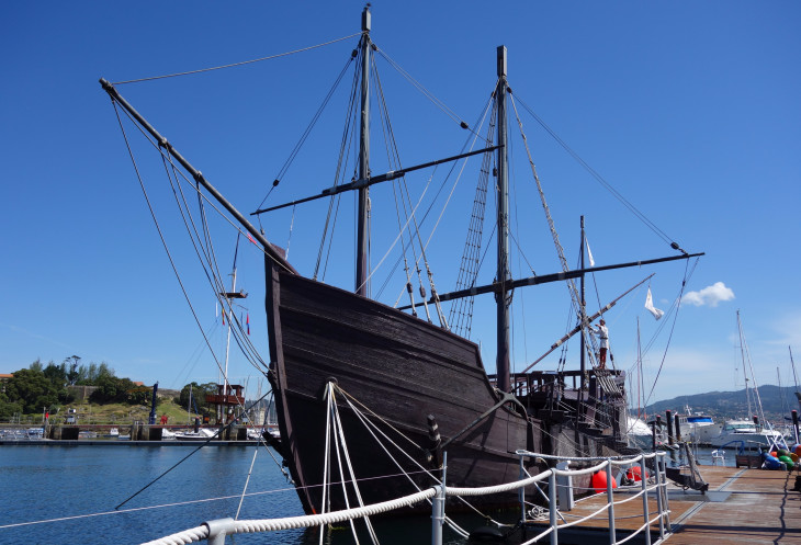 А по программе в тот день было посещение Байоны. Небольшой городок знаменит тем, что одна из каравелл экспедиции Колумба (Пинта) добралась до европейского берега именно здесь (Нинья с Колумбом на борту достигла берега в другом месте). Этому событию тут посвящены памятники, улицы, на рейде стоит музей-корабль, копия той самой Пинты. Ну как копия, корабль аналогичного класса и размеров. Кстати, размеров очень небольших, даже удивительно, что не потонул в океане. Я, конечно, не ожидала, что во времена великих географических открытий ходили на «Титаниках», но это даже скромнее по размерам, чем плавучие рестораны на набережной Невы, скажем.