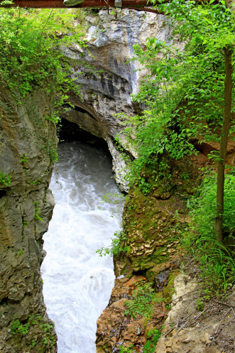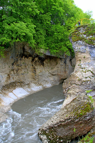 Однако камни под ногами настолько стерты многочисленными ногами, что очень легко поскользнуться, даже держась за перила. Не говоря о дожде, во время которого камни под ногами становятся еще более скользкими. Под именно такой дождь мы и попали. Так что безопасное нахождение на территории теснины относительно, особенно в отношении подвижных и активных детей, которых в этот день было много.