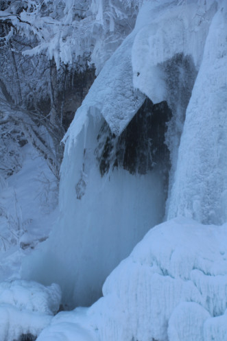 Ну да ладно, поехали на поиски чуда природы, водопада Плакун. Навигатор дал нам самую короткую дорогу, где можно было проехать только на вездеходе, немного побуксовав, решили вернуться на дорогу с асфальтом. Сомневались, ехать дальше искать водопад или продолжать движение согласно маршруту. Хотя милая и сопротивлялась по тихому- мол застрянем-куда за трактором идти.. Я таки, настоял ехать по интуиции к водопаду, и это здорово! Природа, сказать красивая, это не сказать ничего... Зимой Плакун смотрится просто потрясающе, при -26 водопад создал себе естественную голубющую ледяную скорлупку, на солнце играет всеми цветами радуги. Все фото были против солнца, но у нас график.. ловить момент не могли себе позволить..Женщины как дети..Подвесной мост напомнил детство моей милой, ходила по нему и причитывала: как у бабушки в Архангельской области был такой же, только раза в 3 выше...