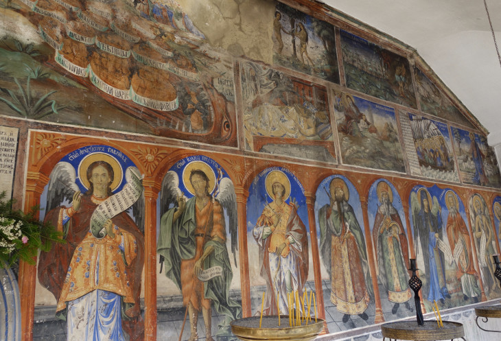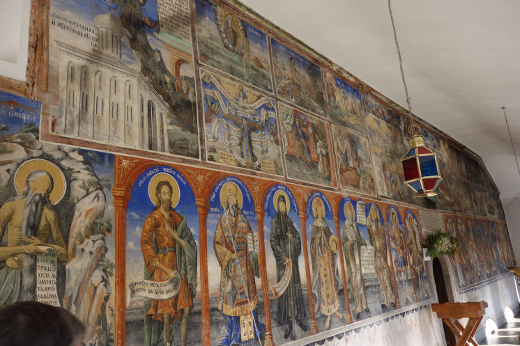 Город условно делится по реке Вардар на мусульманскую и православную часть, да еще где-то есть цыганская, куда ходить не советуют. Поселили нас в отеле Амбассадор, рядом с российским посольством. Отель очень затейливый, номера все разные, санузел с большим окном. Это был единственный отель на всем пути, где в номере был чайник. Так как Лилиана выморозила меня кондиционером в микроавтобусе, то горячий чай пришелся кстати. А местами мы с ней на следующий день поменялись: она села на первый ряд за водителем, а я на ее место рядом с водителем — все довольны. Перед отъездом из Скопье посетили симпатичный монастырь св.Пантелеймона, а македонский гид подарил нам по открытке с изображением тамошней фрески.
