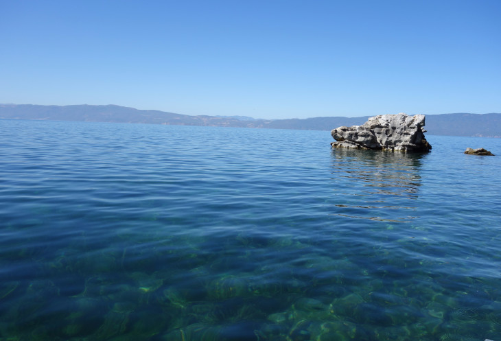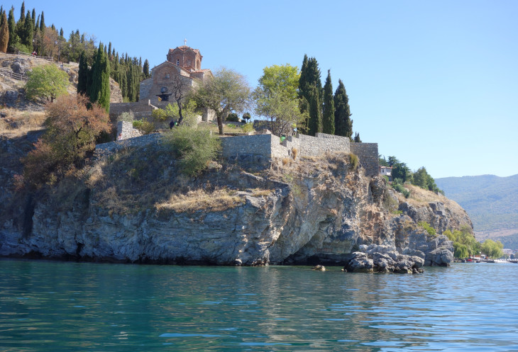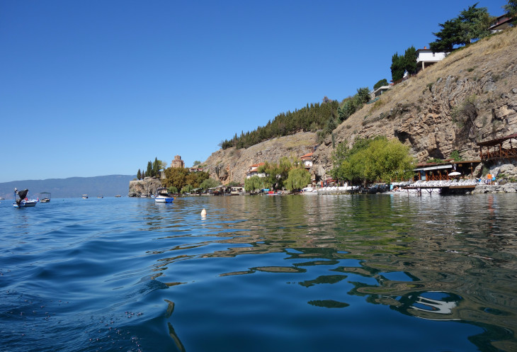 А озеро очень красивое, особенно в первой половине дня — цвет воды изумительный. В ходе экскурсии за пару евро нас прокатили на моторке, а потом я пошла купаться. Вода очень чистая, хотя уже и не очень теплая. Но у нас в Оби и летом вода холоднее бывает, а тут середина сентября. Еще Охрид славится своим фирменным жемчугом: из перламутра с раковин готовят особую смесь и покрывают ей бусины, как ногти лаком. Только лак крепкий. Продают это добро и на улице, и в магазинах. Насколько «серебряное» серебро у уличных торговцев, не знаю. Цены разные, не особо дешевые.