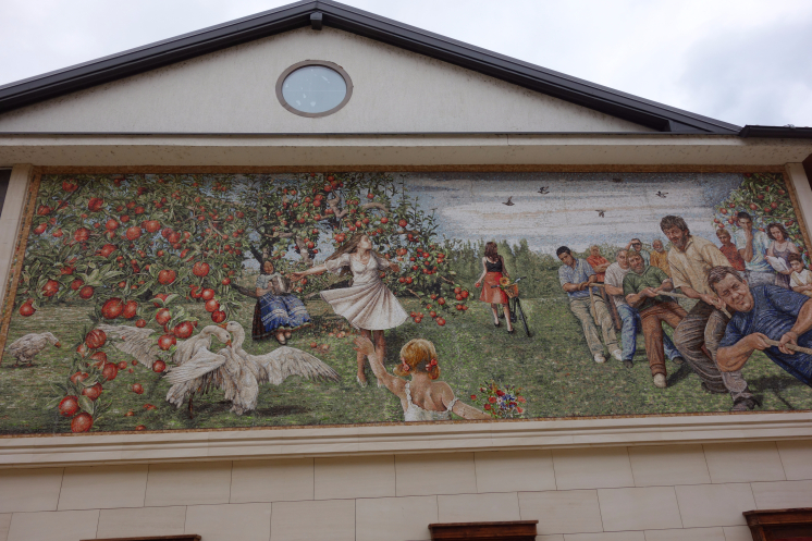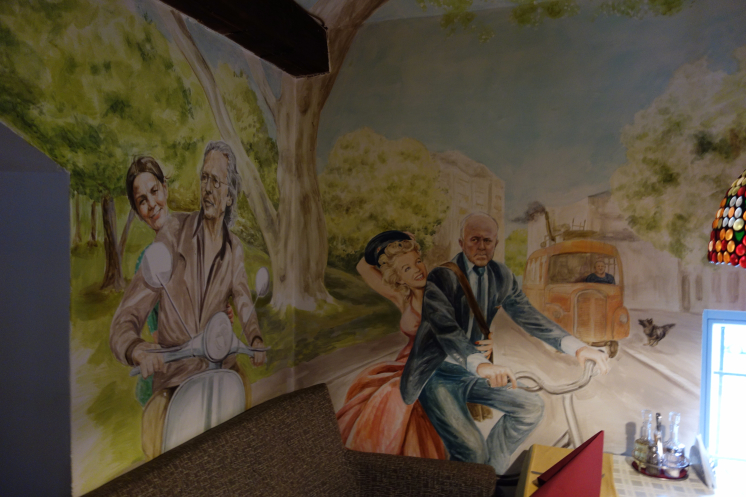 Эмир Кустурица построил в Вишеграде Андричград в честь писателя. Строительство еще не закончено, но кое-какие мероприятия уже проводятся. Мы там пообедали в ресторанчике «Златна коруна». Кормежка очень приличная, но главное — оформление: стены расписаны жанровыми сценками с участием мировых знаменитостей вперемежку с местными жителями. И сам Кустурица изображен.