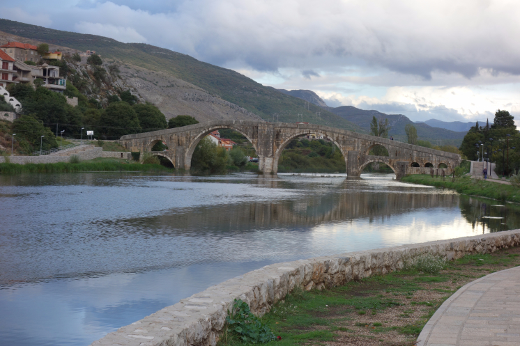 Старый город посмотрели, а потом я прошлась по набережной до моста Арсланагича. Удивительно, но, когда в 1965 году появившееся в результате возведения плотины водохранилище затопило построенный в 16 веке по приказу Мехмед-паши Соколовича мост, общественность возмутилась, водохранилище спустили, мост аккуратно разобрали и перенесли на новое место. Трудность была еще и в том, что изначально мост соединял берега разной высоты — нужно было подобрать подходящее место. А мост красивый!