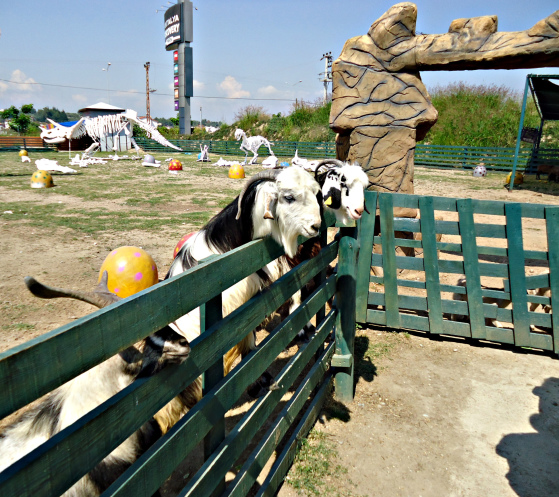 Далее наша экскурсия продолжилась в небольшом контактном зоопарке, где свободно гуляют козы, бегают по всей территории кролики, ходят курочки, важно прогуливаются индюки. Всех этих животных можно кормить кормом, который насыпан в специальные ящички и контейнеры.