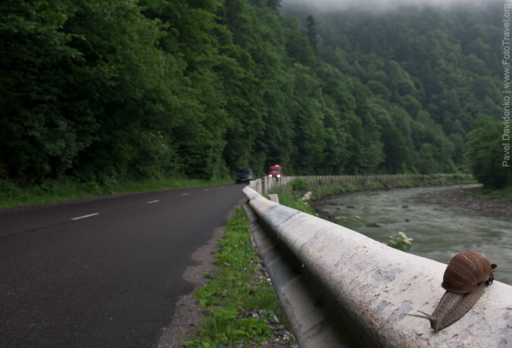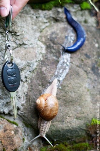 Затем у нас был намечен переезд к Теребле-Ольшанскому водохранилищу. По пути мы заехали на водопад Труфанец, где повстречали синих слизней и виноградных улиток. Я сначала было обрадовался, что их тут так много, и вечером у нас на столе будут деликатесы (перед выездом я нашел 3 рецепта приготовления этих моллюсков). Но потом понял, что меня не поймут другие участники путешествия, и решил эту идею отложить до следующего раза . Не спеша позавтракали у водопада.