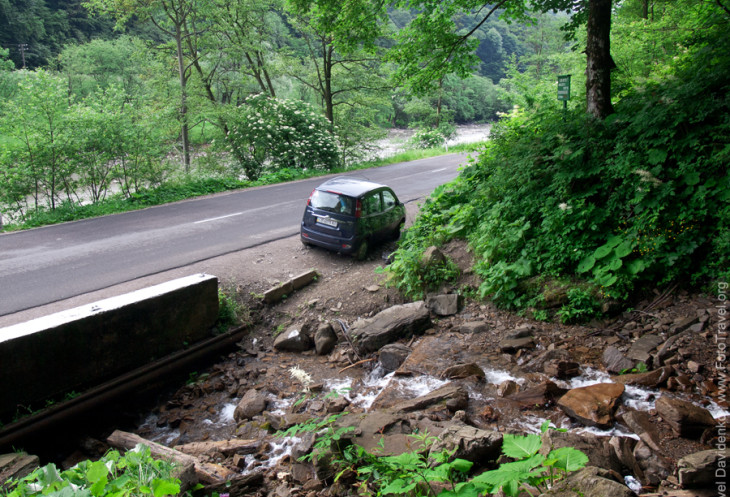 Дальше наш путь лежал по узкой однополосной дороге. Дорога была со следами размывов от паводков. В некоторых местах половина дорожного полотна была смыта водой. Приходилось объезжать по обочине встречной полосы. Мы удивлялись, как по такой узкой дороге с очень крутыми поворотами да еще и с ее отсутствием в некоторых местах, умудрялись ездить «Неопланы» дальнего сообщения. Несмотря на все недостатки дороги, ехать было очень приятно, нас окружали чудеснейшие пейзажи Прикарпатья.