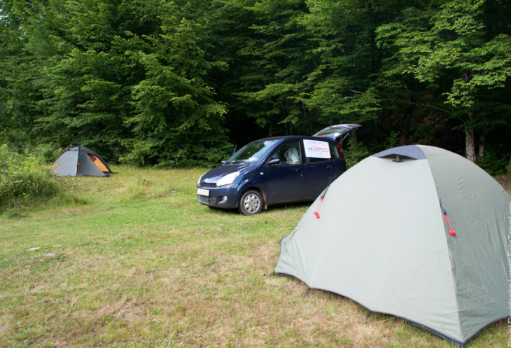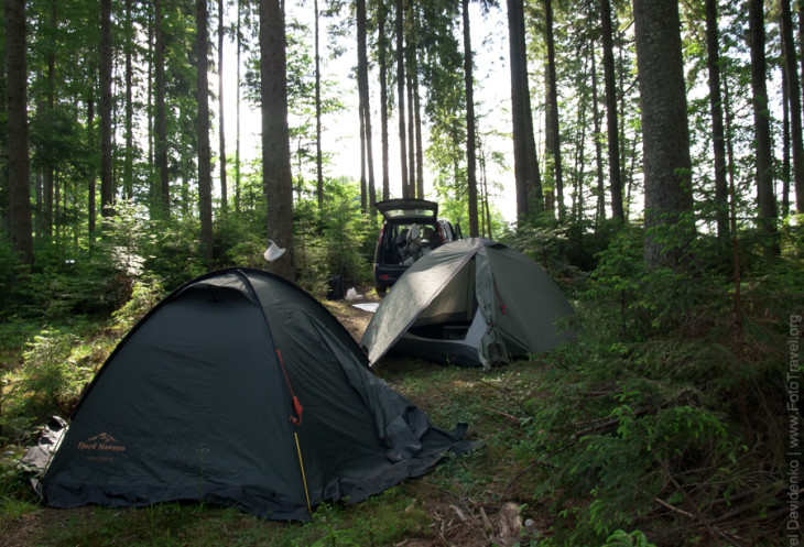 Когда подъезжали к повороту на Каменку, уже стемнело. Мы увидели поляну просто-таки забитую палатками и машинами. Оказывается, окрестности водопада на р. Каменка, куда мы приехали, очень популярное место отдыха. Как правило, такие места кемпинга платные, но мы нигде не увидели смотрителя, собирающего плату. Заехали на поляну и поставили палатки на свободном месте.