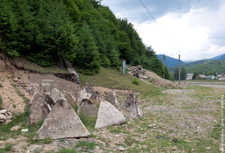 Во время переезда мы наткнулись на бетонные пирамидки лежащие группами вдоль дороги. Зная, что эти места подвержены наводнениям, мы решили, что эти пирамидки – это укрепления дороги от размытия потоками воды. Но дальше мы увидели указатель музея «Линия обороны Арпада». Остановились возле одного из бункеров, подошли к плакату-схеме и начали изучать его. В ходе изучения мы узнали, что эти бетонные пирамидки являются противотанковыми заграждениями времен Второй мировой войны. Полностью все объекты музея мы не посетили, оставили на следующий раз.
