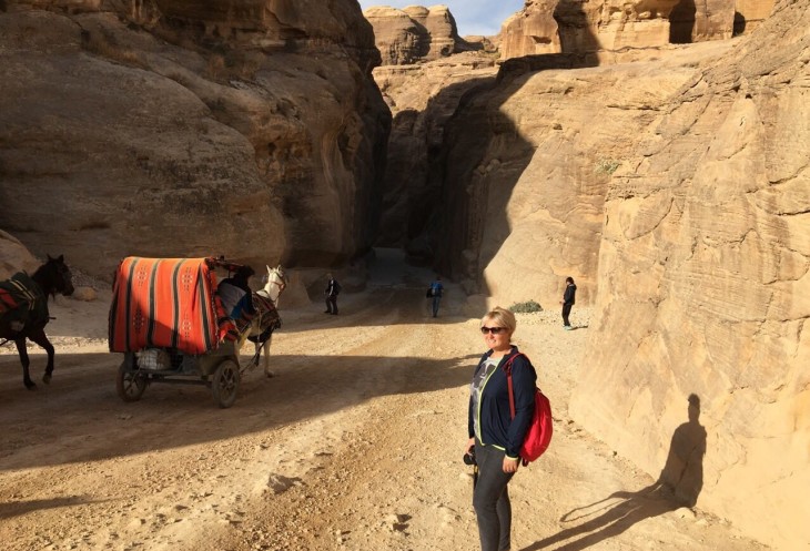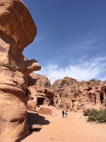 Нам удивительно повезло с погодой. Начало ноября, это идеальное время для путешествий по Иордании. С утра было немного прохладно +16, но днем комфортно и тепло +21. Во время прогулки совсем не почувствовали усталости. Но здесь есть все и для каждого путника. Бедуины могут сварить кофе или чай, сделать свежевыжатый сок из гранатового яблока или апельсина. Продаются разные снеки, вафли и печенья. Конечно огромное количество сувениров. Но а тем кто устал, и сил идти больше нет, бедуины предлагают свой вид транспорта – верблюдов и ослов.
