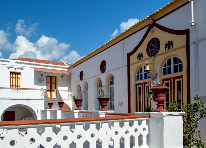 Саму обитель построили в XIV веке, в эпоху, когда островом владели рыцари Иоанниты.Потом османские захватчики нанесли очень сильный ущерб монастырю, а заново отстроили его только в XVIII веке. Главный храм монастыря украшен великолепными фресками, а в резном иконостасе размещена чудотворная икона Архангела Михаила Панормитиса.