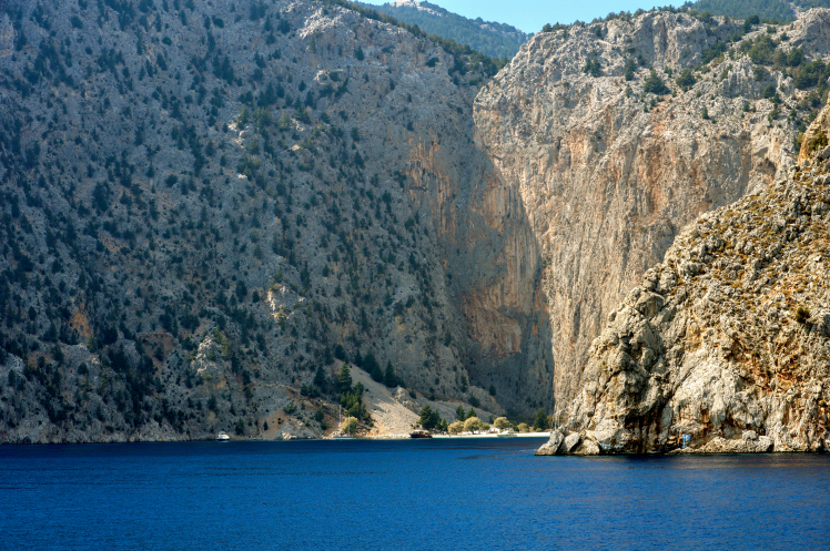 Выходим из бухты Панормитис и идем вокруг острова.Издали любуемся живописными бухтами и на высокие скалы фьорда Св.Георгия.