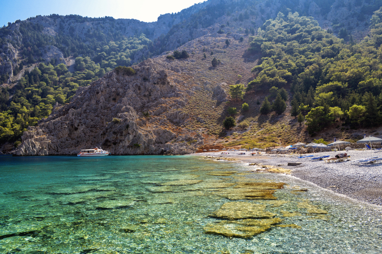 Пляж Агиос Георгиус полностью отрезан от цивилизации высокими отвесными скалами.Высота их достигает 300 метров,что делает бухту недоступной с берега.Поэтому и добраться сюда можно только на лодке.Место дикое, уединенное и очень красивое.Сам пляж галечный,местами каменистый.Но вода настолько прозрачная и чистая,что виден каждый камушек)) Скалы закрывают от ветра,поэтому в бухте тепло,вода тоже теплее,чем на Родосе.Так как пляж дикий,то никаких лежаков и кафе тут нет).