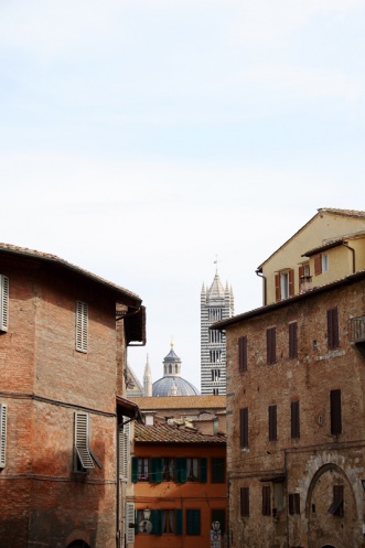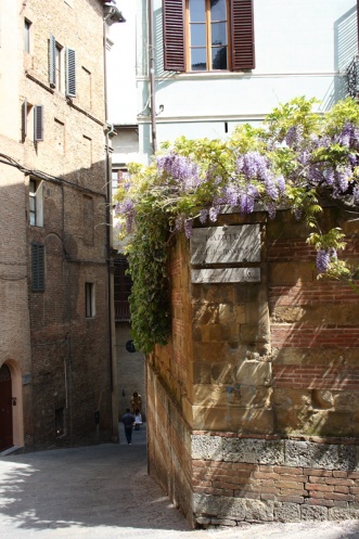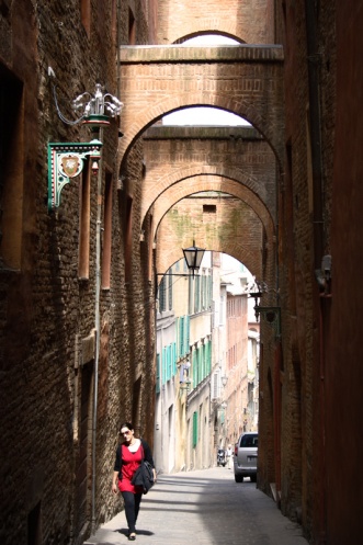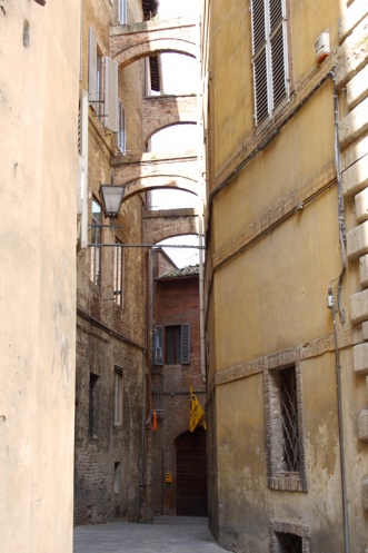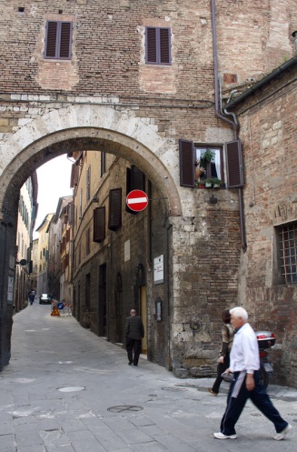 Ходить по извилистым улочкам города одно удовольствие. Они не похожи друг на друга и за каждым поворотом всегда можно увидеть что-то новое – от входа в новую контраду, украшенную ее символами, до мимов изображающих бронзовые фигуры, причем сразу и не скажешь, что это живой человек, а можно, следую узкими мощенными дорогами, выйти на площадку с которой откроется потрясающий вид на Сиену.
