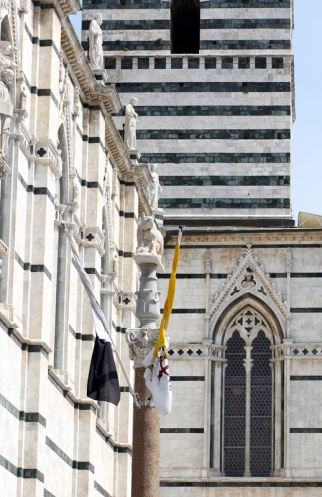 флаги участвующих в Палио контрад вывешиваются на площади рядом с Сиенским Кафедральным Собором.