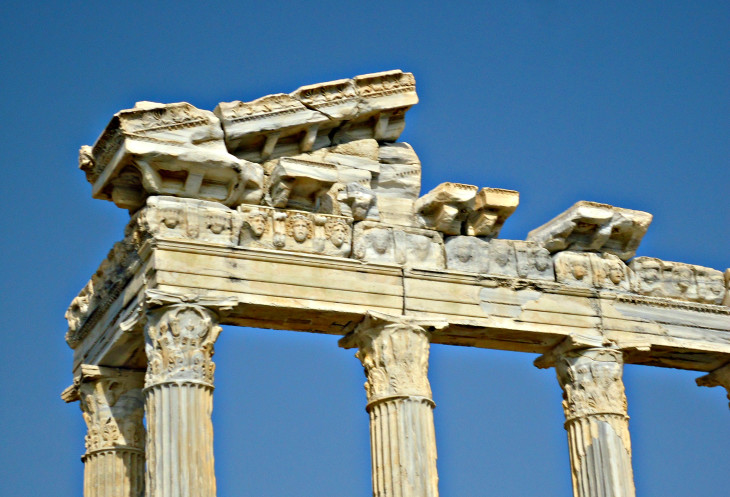 Храм возвели в честь античного бога Аполлона - покровителя красоты и искусства - ещё во II веке н.э. К сожалению, эта «визитная карточка» города серьёзно пострадала во время мощного землетрясения тысячу лет назад. Строили эту красотищу несколько десятков лет, а разрушена она была буквально за пару часов… От всего этого великолепия остались лишь живописные руины, остатки фундамента и пять колон.