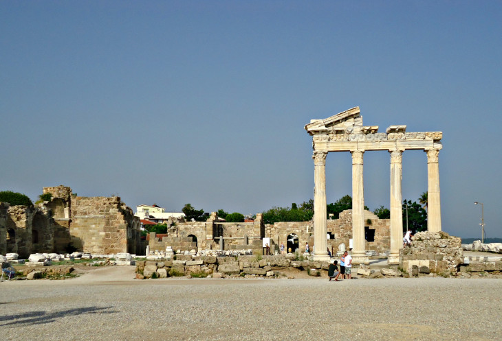Буквально ещё 5 лет назад помимо этих пяти исторических колонн на побережье Сиде внимание туристов привлекали и полуразрушенные остатки византийской базилики, тем более входы в них не были замурованы! Разумеется и тут, и сям валялись обломки колонн, плит, архитектурных фрагментов, в большинстве сделанных современными турками-умельцами.