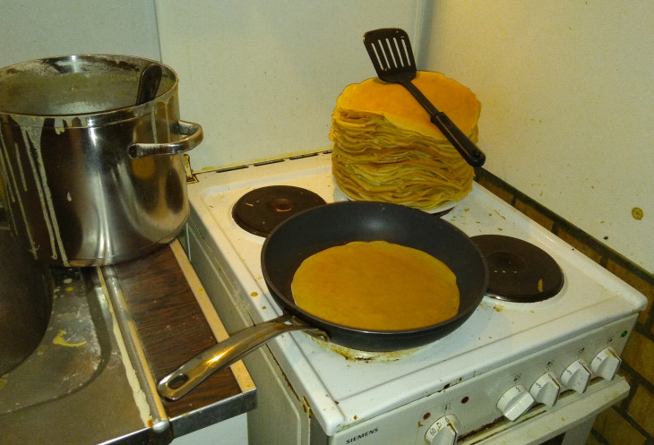 У У. скоро днюха и они отмечали ее на работе. Засим он слепил тортег (который я презрительно называла сладким хлебом, а коллеги очень оценили. Мне не досталось), а я полночи жарила гору блинов. В одной точке сошлись отлично подходящая для блинов ско...