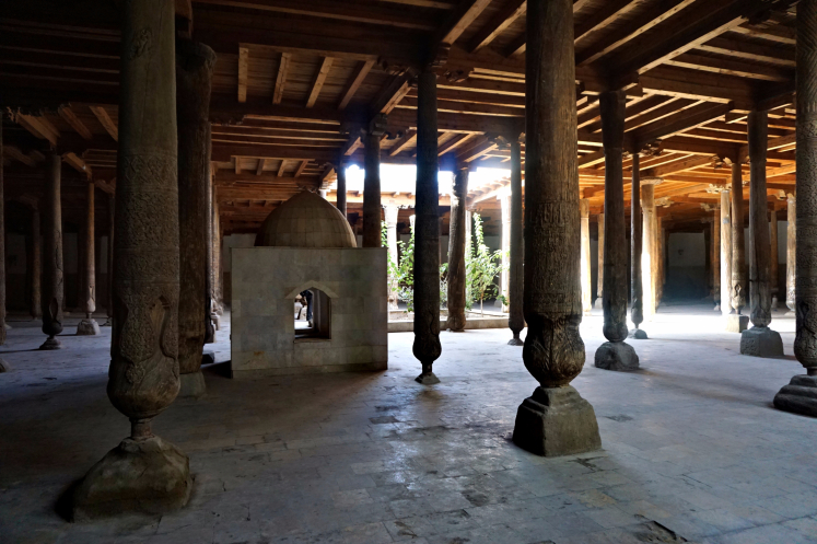 Очень своеобразной, не вписывающейся в эту традиционную схему, оказалась мечеть Джума. Она не имеет порталов, куполов, галерей, внутреннего двора. Снаружи смотреть нечего, а вот внутри что-то необыкновенное: 213 деревянных колонн, и ни одной одинаковой.