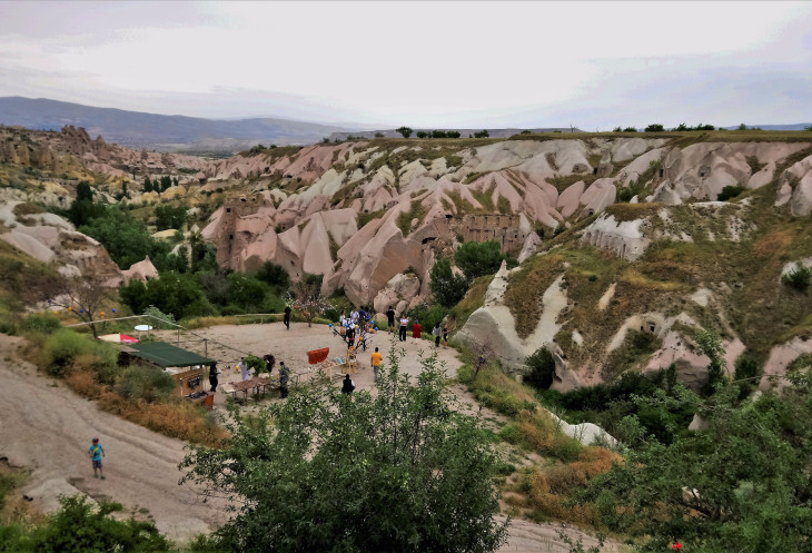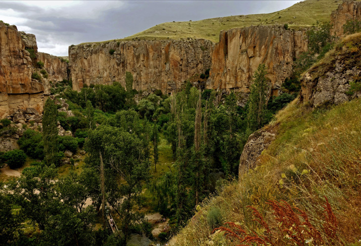 Этот каньон знаменит тем, что 17 веков назад здесь поселились византийские монахи. Трудолюбивые монахи выгрызли себе в каменных стенах каньона жилища и церкви подобно тем, что находятся вокруг села в Гёреме. Население каньона в те стародавние времена достигало 60 тысяч человек. Место очень живописное. Нас привезли ко входу- спуску в долину- и мы дальше не спеша прошли пешком, разглядывая всё вокруг и восхищаясь. Жаль только, что погода была пасмурная, даже дождик иногда капал.