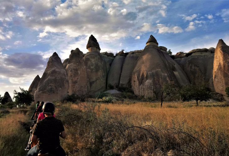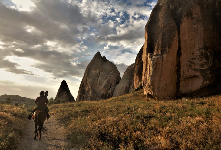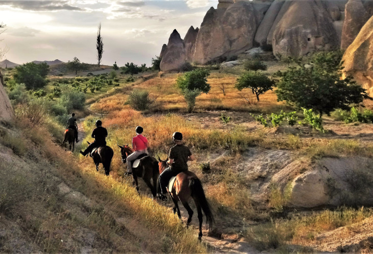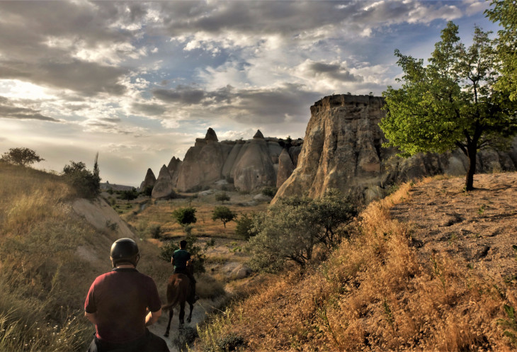 Лошадки аккуратные, ухоженные, обученные ходить гуськом и терпеть любого наездника. Правда, руководитель нашей группы говорил на турецком, на английском мог сказать только «май френд», «райт» и «лефт» (в общем, чтобы руководить передвижением достаточно), на русском- ни слова. Если бы я раньше ни разу не сидела в седле, то, наверное, чувствовала бы себя не очень комфортно…. А так взяла в одну руку поводья, в другую- фотоаппарат, и прямо со спины лошадки «щёлкала» всё вокруг, потому что красота вокруг невиданная, эмоции зашкаливают и хочется это всё запомнить, запечатлеть.
