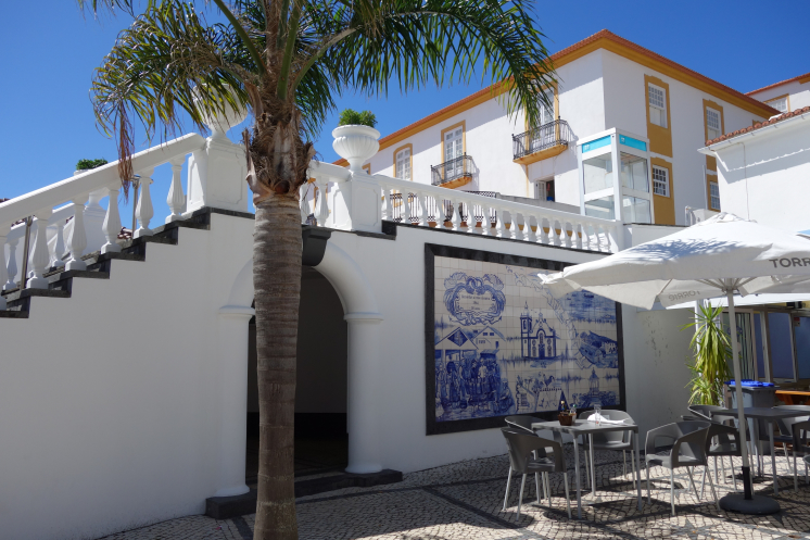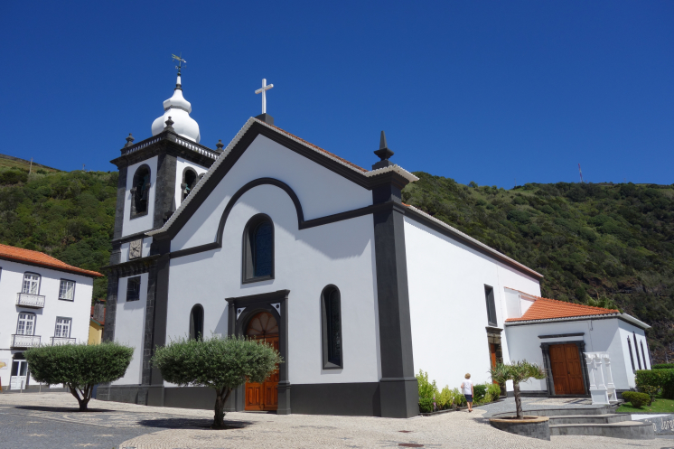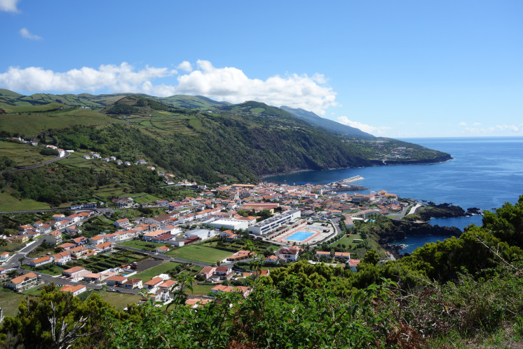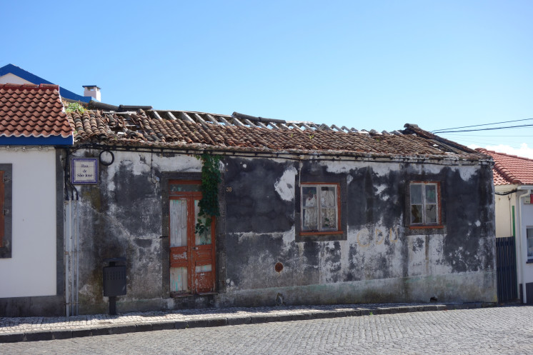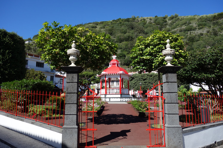 После этого скромного, в общем-то, восхождения нас подвезли до ресторанчика на центральной площади городка Велаш — столицы острова Сан-Жоржи. Половина заказала по меню, я вместе с остальной половиной заказала «блюдо дня» — комплексный обед. По просьбе Ларисы в него включили разливное Vinho Verde — «зелёное вино», которое по вкусу и крепости напоминало сидр, тоже слегка шипучее. Мне понравилось, и я попросила продать мне с собой. Девочки налили в освободившуюся из-под воды полторашку и продали за 8 евро. Меня бы больше устроил литр или даже половина, но такой вариант не предлагался. А в гостинице вино мне уже не показалось таким вкусным, но я его до следующей ночи домучила: мы летели на Терсейру, с собой не возьмешь. После ресторанчика мы прошлись по улочкам «столицы», зашли в супермаркет и поехали к месту дислокации.