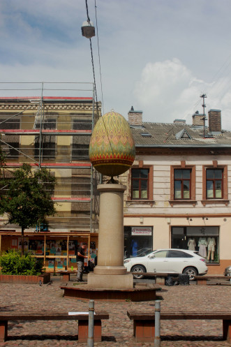 Потом мы пошли по улочке меж старых домов (улица Св. Стефана / SV.STEPONO). Первое, что нас там поразило, помимо мусорной свалки (хотя и довольно культурной), это скульптурная композиция «Пасхальное яйцо».