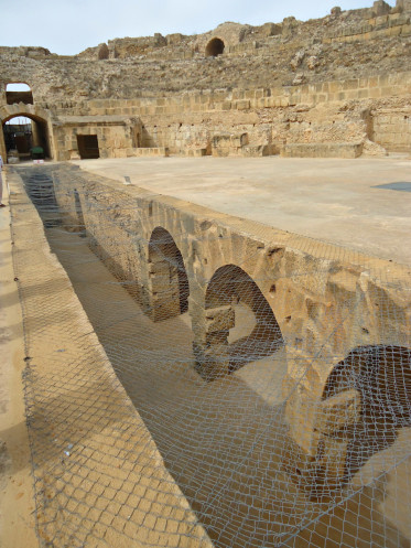 Оказывается, данный амфитеатр был построен прямо в холме - так строили многие первые римские амфитеатры!:-) Очень выгодно экономически: нашли холм, вырыли из него грунт, установили трибуны ... Амфитеатр в Эль-Джеме моложе удненского на целое столетие, построен на ровном месте; там уже для его строительства доставлялся камень-песчаник из карьеров Салакты (надо же, возили аж за целых 30 км от Эль-Джема!).