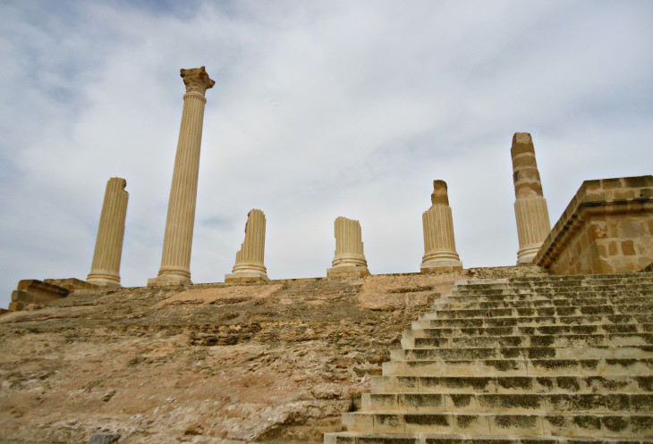 С верхних рядом амфитеатра видна вторая достопримечательность Удны - Капитолий, представляющий из себя основание и несколько колонн.