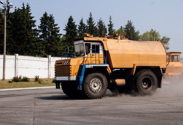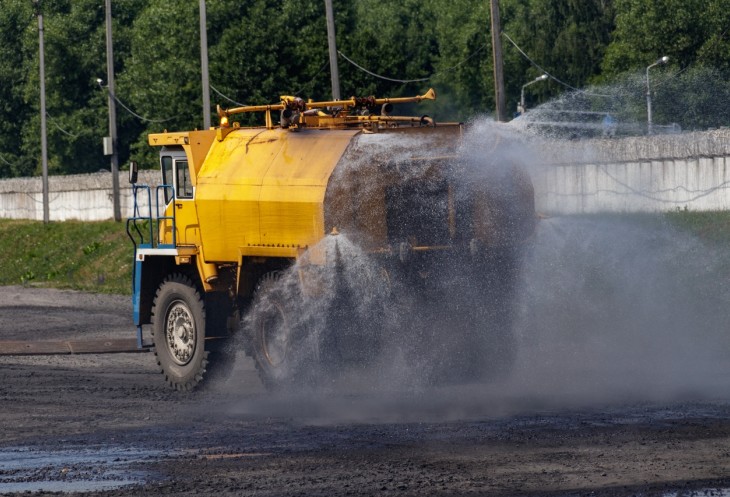 Из-за пыли, которую подняли колеса самосвала, не видно дороги. Поэтому водой эту пыть и осаждают.