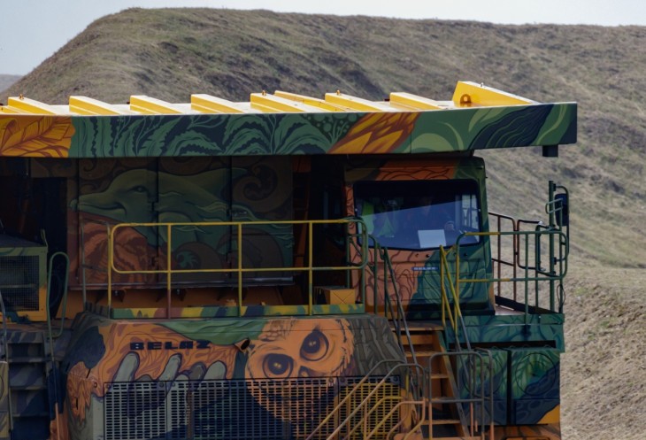 Очень эффектно смотрится машина, раскрашенная вот таким образом. Этот самосвал грузоподъемностью 110 тонн.