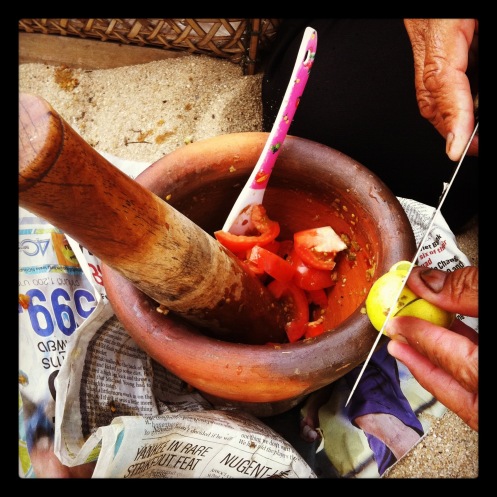 Поесть на пляже можно и не в баре: там постоянно курсируют бабушки с жаровнями и ступками в подвесных корзинах и при вас готовят потрясающие блюда, типа острого салата с зеленой папайей.