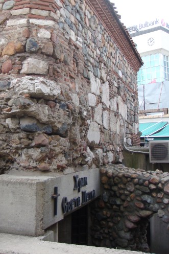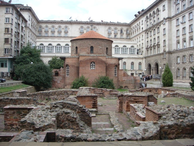 и напротив, за львом, - Церковь Св. Софии - главный соборный храм в седние века, под которым вообще некрополь древней Сердики... сам храм по датам своего основания относится к началу IVв., правда, в VI в. базилику восстанавливали, поскольку она сильно пострадала во времена гуляния разных варварских племен.
