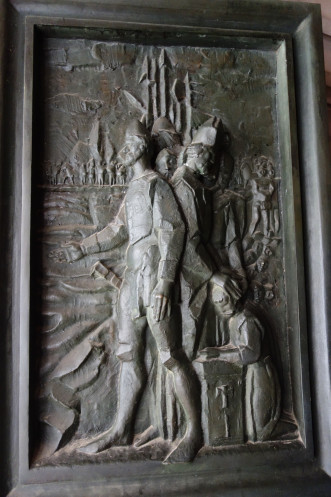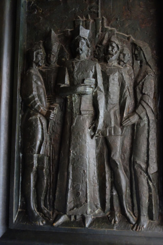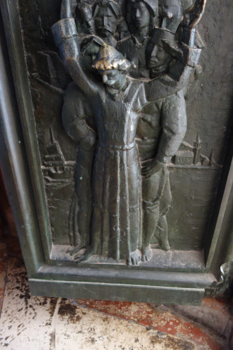 Колонна со статуей Роланда была закрыта щитами (вроде оригинал статуи перенесут в музей, а на площади установят копию). Удивительно, но изображенное на щите лицо мне показалось очень похожим на статую Роланда в Бремене.