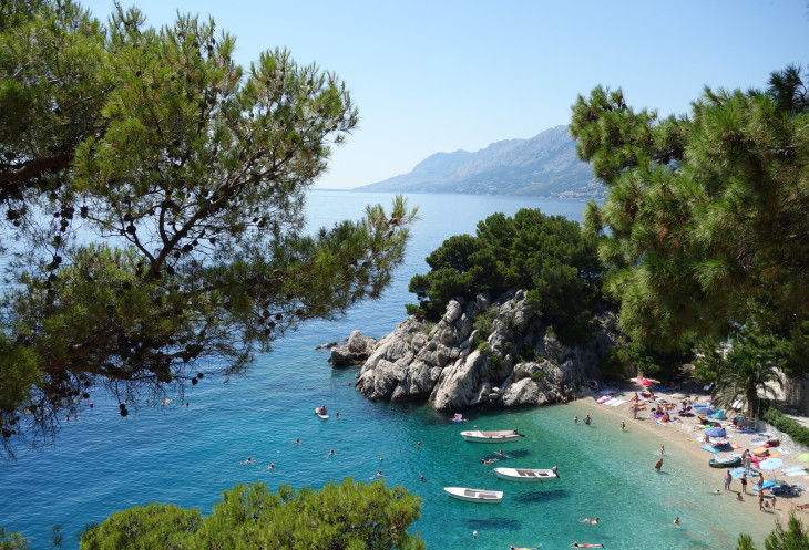 Камень, спору нет, очень живописный. Ну и вообще там очень много сосен, некоторые раскинули лапы прямо над пляжами, чем народ активно пользуется, спасаясь от жаркого солнца. И запах от нагретых солнцем сосен на пляже стоит замечательный. По всему побережью большое предложение водных аттракционов: классических «бананов» не видела, но на «диванах» народ активно катался, как и на гидроскутерах, водных лыжах и привязанных к моторке парашютах (не знаю, как это правильно называется). Еще на соседние острова Хвар и Брач кораблики возят желающих. Берег там тоже галечный, хотя издалека кажется, что песчаный. Местные говорят, что из-за обилия островов на побережье практически не бывает волн. Вполне возможно: волны были, только когда налетел ураганный ветер, но длилось это недолго. Неожиданно выявилось преимущество гальки: после дождя она быстро обсыхает, в отличие от песка, и полотенце не отсыревает. Вообще с погодой мне, надо сказать, повезло: я попала под ливень один раз, когда пошла в магазин в верхнюю Брелу (нижняя появилась, когда пришла мода купаться в море). Сильно меня тогда удивили работники в оранжевых жилетах, которые сметали швабрами с проезжей части осыпавшиеся после сильного ветра сосновые иголки и паковали их в мешки для мусора. При этом с небольшой территории стоянки для автомобилей работник сдувал иголки «антипылесосом», а тут трассу мели швабрами! Боюсь, тот ливень с градом, от которого я пряталась с зонтиком под соснами, сильно побил тех работяг.