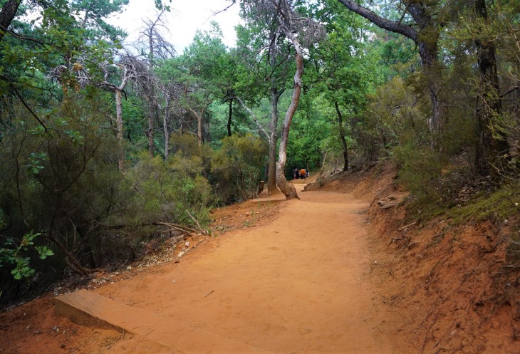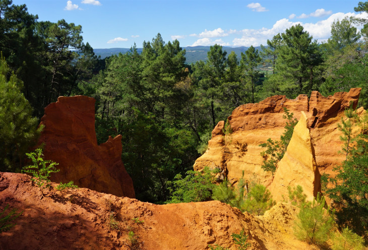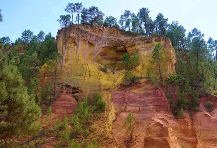 Он поражает своей цветовой гаммой: весь в красно-желтых тонах. В этих местах добывали охру, так как окрестные глинистые холмы содержат в себе соединения железа, которые придают им очень яркий, колоритный цвет, особенно на фоне зелени сосен. Русийон поначалу процветал, а когда охру в конце 20-х годов прошлого века добывать перестали, деревня пришла в некоторый упадок. Но туризм вдохнул новую жизнь в эти места. Старые разработки, красные и желтые утесы, превратили в туристическую тропу. Причем настоящий туристический бум хлынул сюда только во второй половине XX века, одновременно с массовым увлечением цветной фотографией. Это и понятно, черно-белая фотография бессильна была передать необычную красоту этого места. Собственно, ради охряной тропы и приезжают сюда в первую очередь. Все удовольствие стоит 3 евро. За эту цену можно выбрать как легкий и непродолжительный (всего минут 30) маршрут, так и сложный, предполагающий посмотреть гроты - заброшенные места разработок. Мы прошли по легкому и короткому, поскольку хотелось еще побродить по самому Русийону, а во времени нас ограничили.