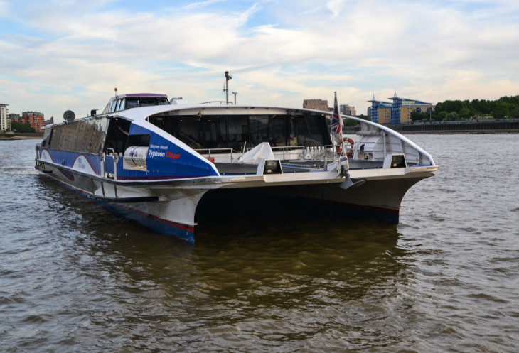Уехать с Собачьего острова мы решили не на метро, а по воде, совместив приятное с полезным и совершив прогулку на кораблике по Темзе. В прошлый приезд в Лондон мы брали Big Bus Tuor, в который включена одна прогулка по реке и мы совершили тогда полуторачасовую прогулку по Темзе. В этот раз мы решили воспользоваться услугами рейсового транспорта. Им оказался катамаран на подводных крыльях.