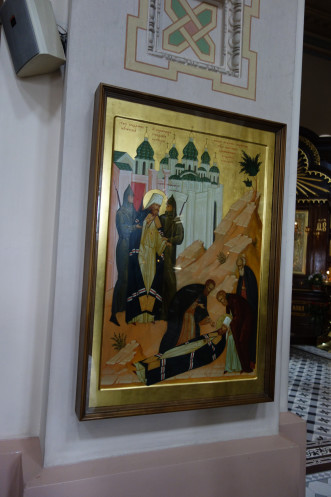 После круга почета по рыночной площади местечка Мир, давшего название замку, двинулись в Несвиж, родовое гнездо Радзивиллов. Для начала зашли в церковь с семейной усыпальницей, скинувшись некоторым количеством белорусских копеек, чтобы Михаил мог продолжить рассказ внутри церкви. В усыпальнице идет реставрация, туда зайти нельзя, но памятные плиты в самой церкви увидеть можно.