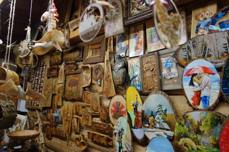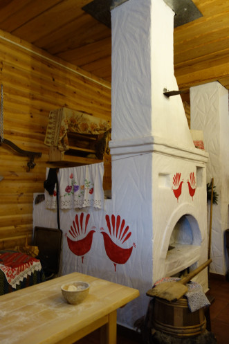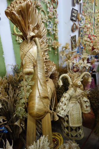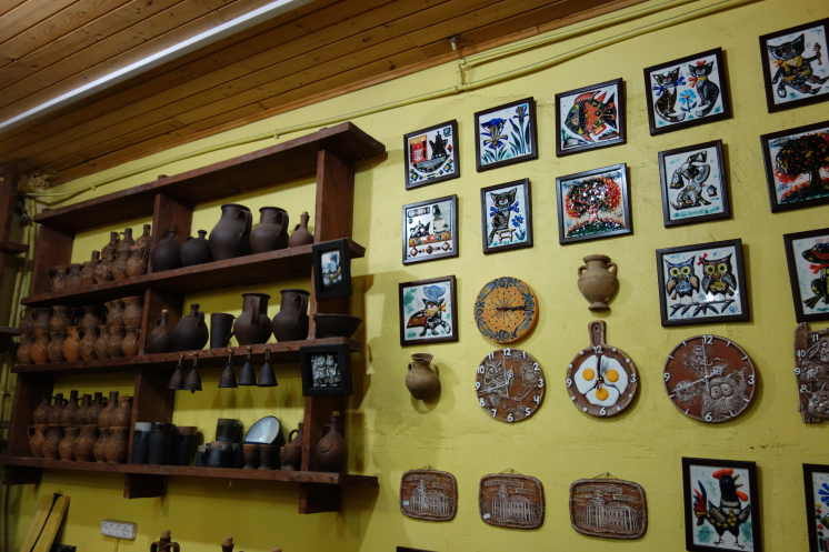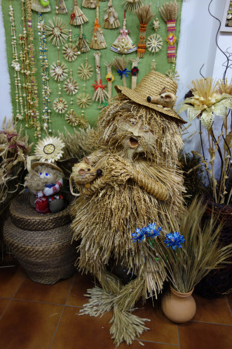 Сам город тоже понравился, хотя вид из окна автобуса не совсем то, что погулять самостоятельно. Свободное время тоже дали, но в полной мере им воспользовались те, кто не поехал в Дудутки. При покупке тура предлагалось заранее оплатить обеды, экскурсии и входные билеты отдельно или пакетом «Оптимум», который был чуть дешевле, чем если брать все отдельно. А в комплект входила и экскурсия в центр народных промыслов и ремесел Дудутки. Опять же, и гончаров, и кузнецов мне приходилось видеть и раньше, и даже поясок из ниток при помощи мини-ткацкого станка я на уроках труда в незапамятные времена делала. Но тут группу сопровождала такая милая, восторженная девочка, которая водила по мастерским, где лепят, куют, ткут, плетут из соломы… Начали мы с дегустации самогона, который там же и делают традиционным способом. В качестве закуски предложили смазать кусочек хлеба медом и положить сверху соленый огурчик. Ну я не специалист, а предложенное количество самогонки можно было и не закусывать. Я после экскурсии купила как сувенир маленькую бутылочку самогона в магазинчике рядом с «дегустационным навесом». Боялась, что не довезу: бутылочка просто заткнута пробкой типа коньячной. Но продавщица щедро замотала бутылёк стреч-пленкой, так что довезла нормально. Из соломы рукодельницы делают не только шляпки, куклы, но и большие сложные фигуры типа Бабы Яги (или как там она называется в тех краях), лошадки… В гончарной мастерской мне очень понравились декоративные керамические рыбы, которые из-за особенности обжига кажутся металлическими. И еще стеклянные панно, которые по витражной технологии делает жена гончара. Там вообще было много красивых интересных вещей, но таскаться две недели с хрупкими предметами и везти домой в такую даль нереально. Хотя керамический магнитик с видом Минска я таки купила: точно не в Китае сделан. По ходу экскурсии мы пробовали домашний хлеб с маслом и сыром ручной работы, пили травяной чай. В кузне один из туристов поработал молотобойцем и под руководством мастера выковал подкову, которую ему и подарили. А корзинка в мастерской плетения очень мне напомнила ту, с которой папа долгие годы ходил за грибами: ее для него сплел отец друга, белорус. В конце программы всех покатали на бричке. Для городских жителей это экзотика. Помню, как в сельской Румынии гид предложил москвичкам сфотографироваться на настоящей телеге, в которую была запряжена настоящая лошадь. Хозяин лошади тогда с усмешкой смотрел на дамочек. Меня конной тягой не удивишь, хотя последний раз я каталась на повозке 11 лет назад в Венгрии на конеферме, где разводили липицианеров.