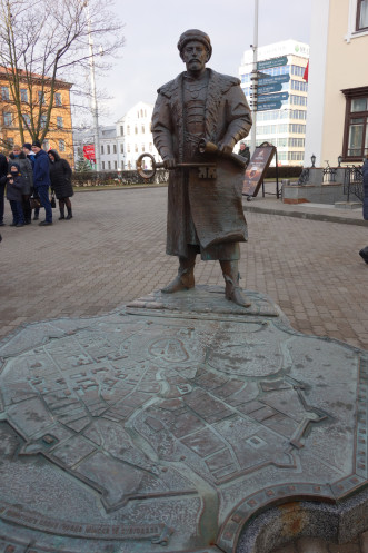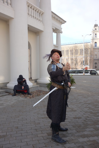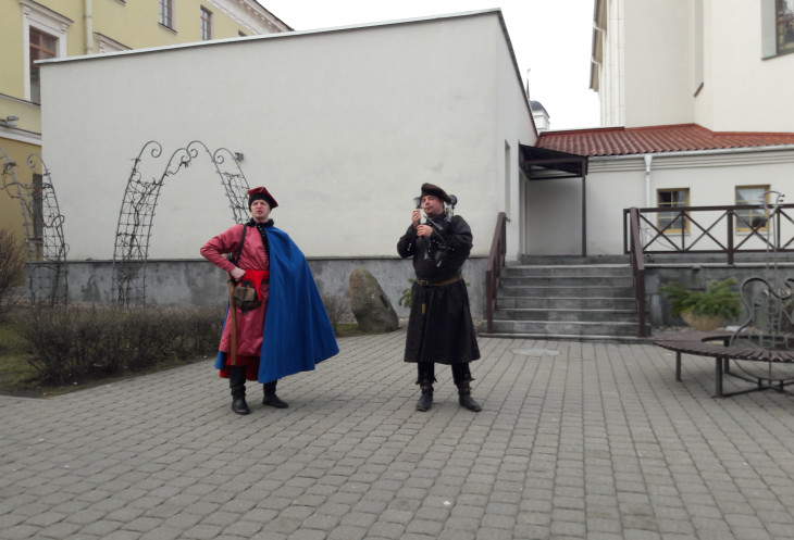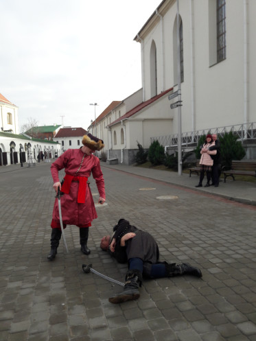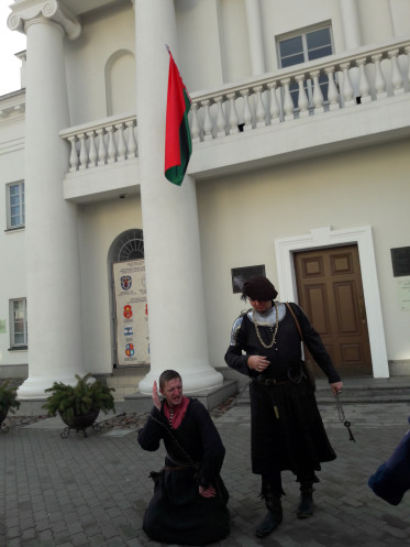 На другой день в автобусе собрали туристов с разной программой (кто-то приехал заранее, кто-то прибыл утром на поезде, кто-то уезжал после Бреста, кто-то после тура оставался дополнительно в Минске). Но организовано Западным трактом ООО «БелАгроТрэвел» все хорошо, и рассадка, и трансферы. Мне досталось место у окна на 3-м ряду слева, что на ваучере выглядело как 3ЛО. А первые ряды не были заняты совсем (Михаил сказал, что у них это запрещено), ну и сзади места были, при желании можно было сесть отдельно. Традиционная обзорная экскурсия была разбавлена несколькими театрализованными сценками из жизни средневекового Минска: пара ребят в исторических костюмах разыгрывала то судью – преступника у ратуши, то горожанина — шляхтича … При этом в действо вовлекались и туристы: то предлагалось взять на поруки преступника, то подудеть на трубе, то всем вместе станцевать. Я не любитель самодеятельности, но тут как-то все было забавно и ненавязчиво.
