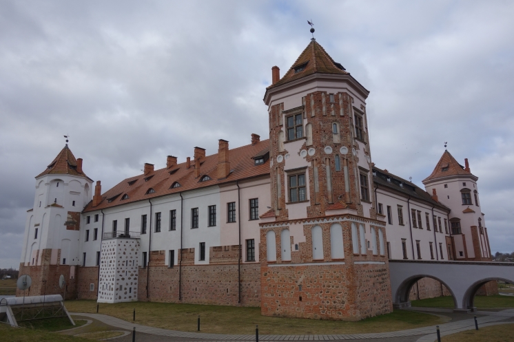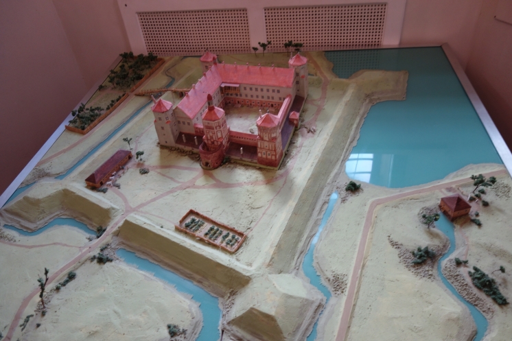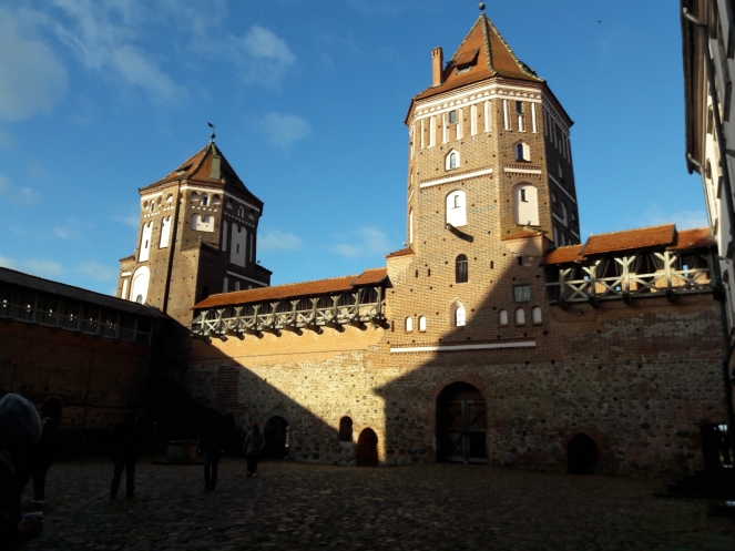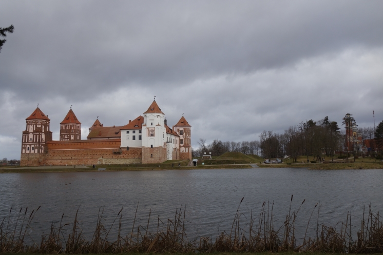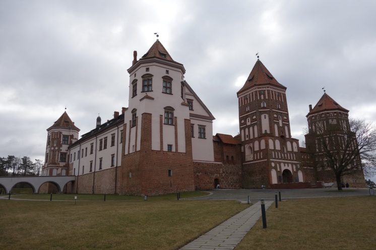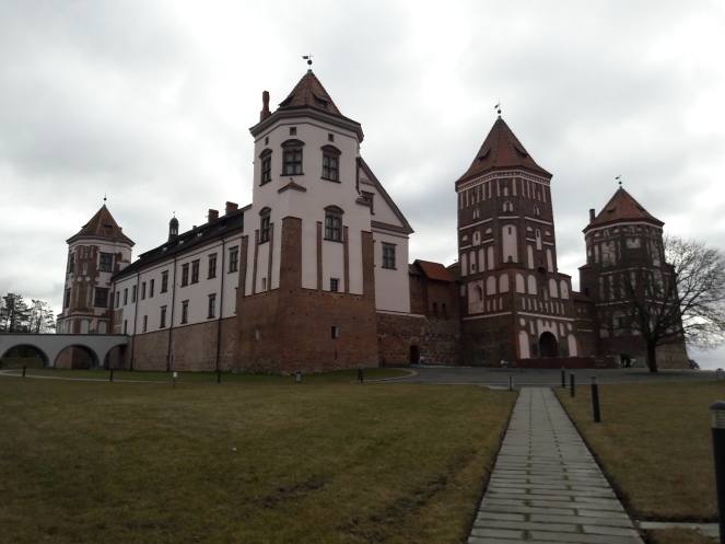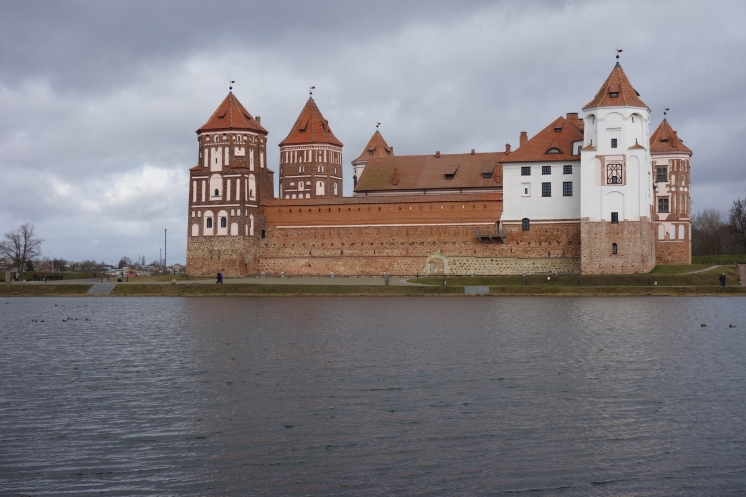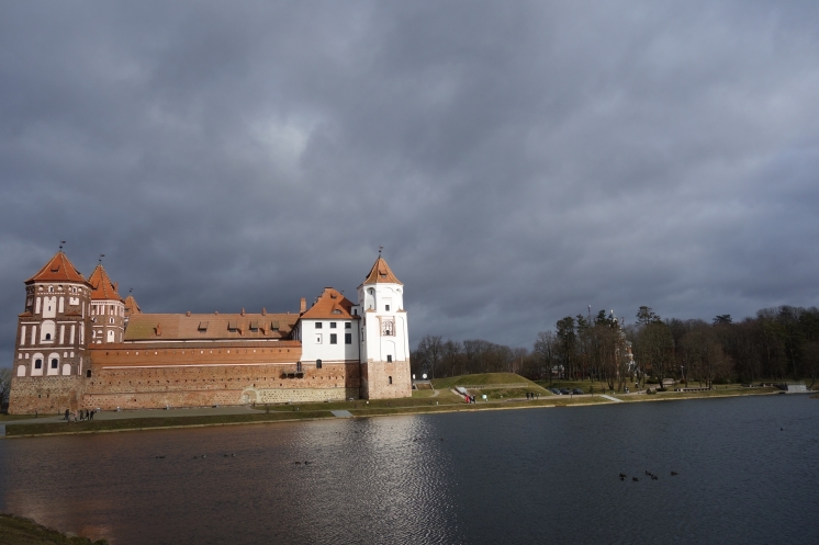 На следующий день мы отправились в Мирский замок, который порадовал относительной немноголюдностью. Впрочем, мы приехали с утра пораньше в воскресный день 23 февраля, которое в Беларуси тоже считается праздником (хоть и не выходным днем). Внешне замок выглядит очень эффектно, внутри тоже достаточно интересная экспозиция. В одном месте предстояло подняться на следующий этаж по узкой спиральной лестнице с высокими ступенями, но желающих провели в обход по нормальной. Я уж совсем было собралась идти в обход, но, глядя на пожилую старушку, храбро полезшую на штурм лестницы, решила рискнуть. Собственно, проблемой для меня была высота ступеней, но зато лестница быстро кончилась. По имеющимся билетам можно было еще подняться на башню, сходить в тюрьму и склеп в церкви, но времени особо не было. Народ посетил сувенирный магазин и сделал снимки со всех ракурсов, в том числе с рекомендованного Михаилом противоположного берега пруда, расположенного у стен замка.