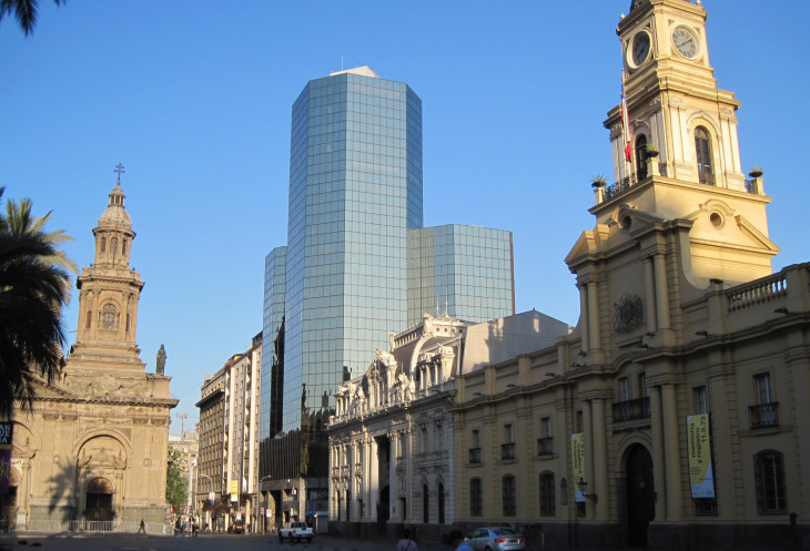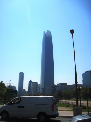 (не смотря на то, что город регулярно потряхивает, а землетрясения 1647 и 1730 годов превращали его в чисто руины, в современном Сантьяго больше семи десятков высотных зданий. Небоскреб Gran Torre Santiago (300 метров, 70 этажей, 2013) (На фото тот что подальше – поменьше Titanium La Portada - всего 194 метра, 52 этажа, 2010). Автор проекта Gran Torre - архитектор Сезар Пелли при участии чилийских архитекторов. Это самый высокий небоскреб в Латинской Америке и второй в Южном полушарии после австралийкой башни «Эврика». В августе 2015 года было открыта для посетителей смотровая площадка «Sky Costanera».