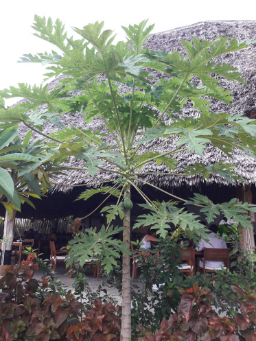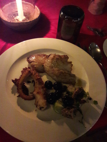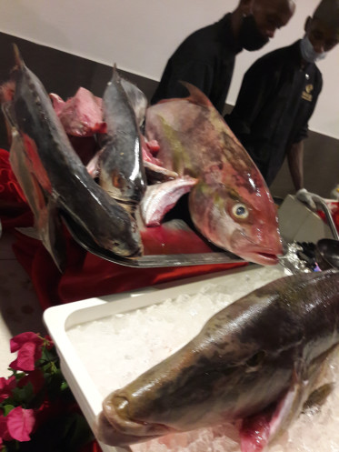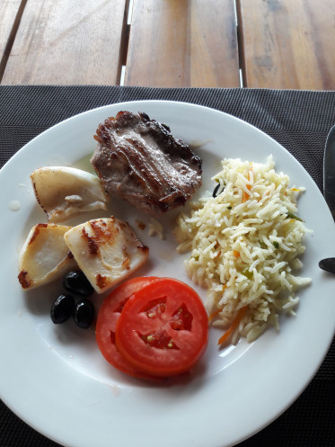 Ресторан в отеле без стен, с высокой крышей из растительных материалов. Дань пандемии: на входах стоят служащие в многоразовых масках и поливают ваши руки санитайзером. Кроме сотрудников аэропорта и отеля, больше никто в масках не ходит. Кормежка по типу шведского стола, только готовят ее при тебе (кроме салатов). Еда, конечно, на любой вкус, хотя с легким итальянским уклоном: хозяйка итальянка, да и гостями острова до недавнего времени были в основном итальянцы. Поэтому на ужин всегда была какая-нибудь паста (кроме множества других блюд). Говядину и курицу я и дома поем, а вот рыба-кальмары-осьминоги и прочие морепродукты у нас бывают только в размороженном виде (хорошо, если только 1 раз размороженном), поэтому питалась ими. Не скажу, что я большой гурман, но все-таки самого вкусного осьминога я ела в Сантьяго-де-Компостела в забегаловке на базаре: там его просто отваривают, специальными ножницами нарезают кусочками в деревянную тарелку, посыпают морской солью и перцем да сбрызгивают оливковым маслом. Поэтому, отведав для порядка морепродуктов в разных соусах, стала подходить только поварам, которые готовили на гриле, не используя ничего, кроме соли и перца. Я не одобряю тех, кто выкладывает в сеть каждый съеденный ими кусок, но тут трудно было удержаться.